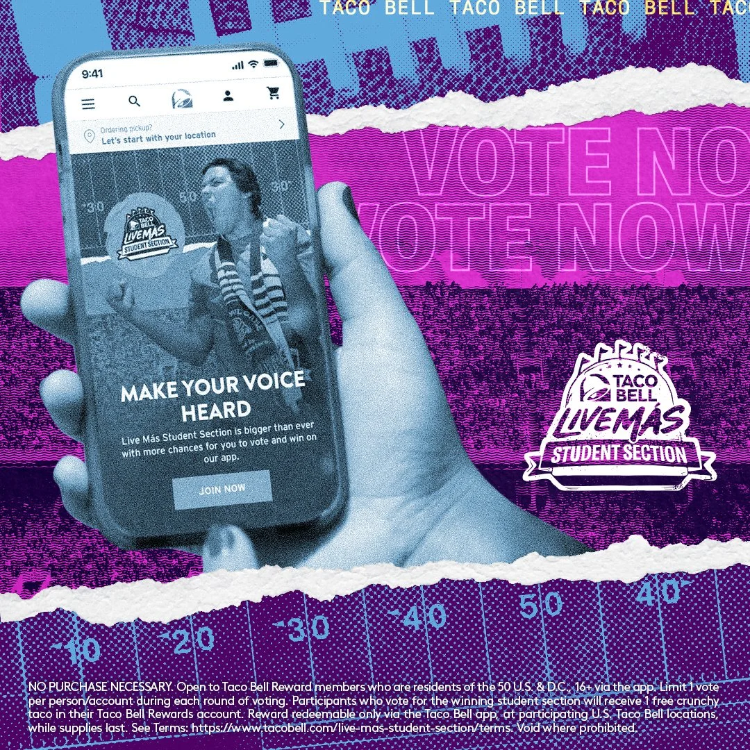 Taco Bell Live Más Student Section is an annual competition that celebrates the most dedicated student fanbase in college football by reserving a section at the College Football Playoff games specifically for 500 students from each school. The program covers the costs for their tickets, giving the biggest game in college football back to the biggest fans – the students.